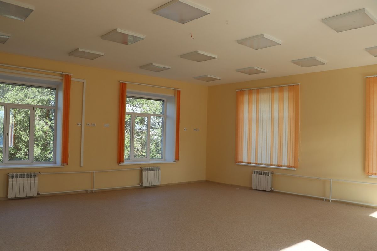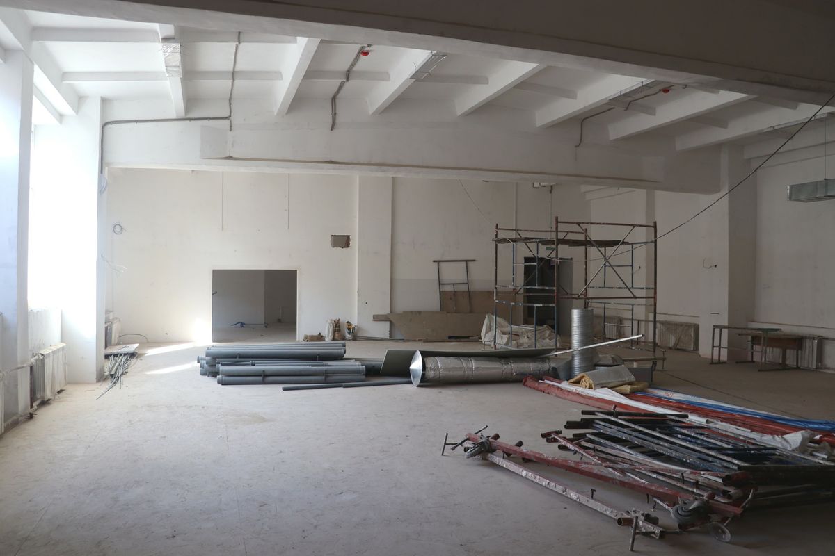 Основные работы сейчас ведутся на первом этаже, где завершается отделка дверных проёмов и идёт оклейка стен обоями. В спортивном зале монтируется специализированное покрытие для пола. В зоне пищеблока завершена укладка керамической плитки и произведена заливка пола.