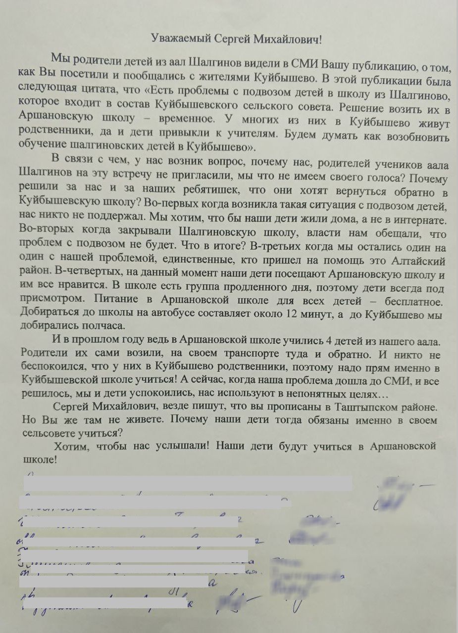 В редакцию «АИС» пришло открытое письмо, которое жители аала Шалгинов в Бейском районе адресовали Спикеру парламента Хакасии Сергею Соколу. Поводом для эмоционального обращения стали заявления политика, касающиеся родителей и детей данного населенного пункта.