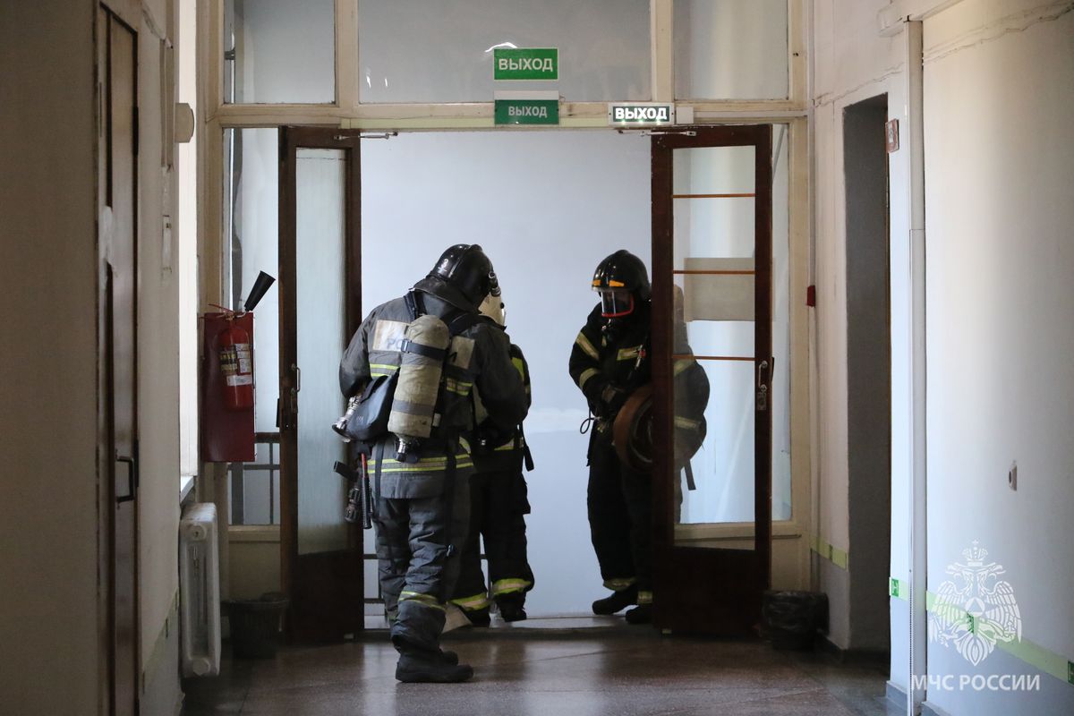 В это время на улице развернули автолестницу, чтобы эвакуировать студентов с верхних этажей. Условный очаг пожара в актовом зале ликвидирован.