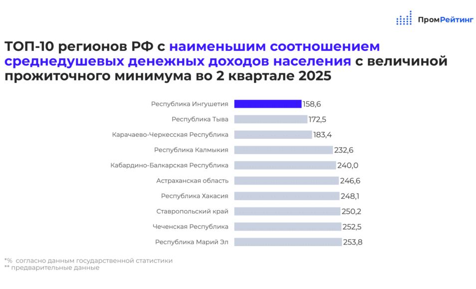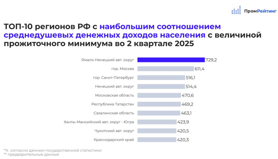 Аналитики исследовательского агентства «ПромРейтинг» продолжают мониторить ключевые показатели социально-экономического положения в стране. На этот раз по итогам второго квартала 2025 года ими был составлен рейтинг регионов, в котором отражено соотношение среднедушевого денежного дохода населения и величины регионального прожиточного минимума. В наибольшем и наименьшем значении.