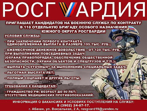 При заключении первого контракта военнослужащим начисляется единовременная выплата в размере 195 тысяч рублей. Размер ежемесячного денежного довольствия составляет от 120 тысяч рублей, а также назначаются дополнительные суточные выплаты, сообщили в пресс-службе Управления Росгвардии по Хакасии.