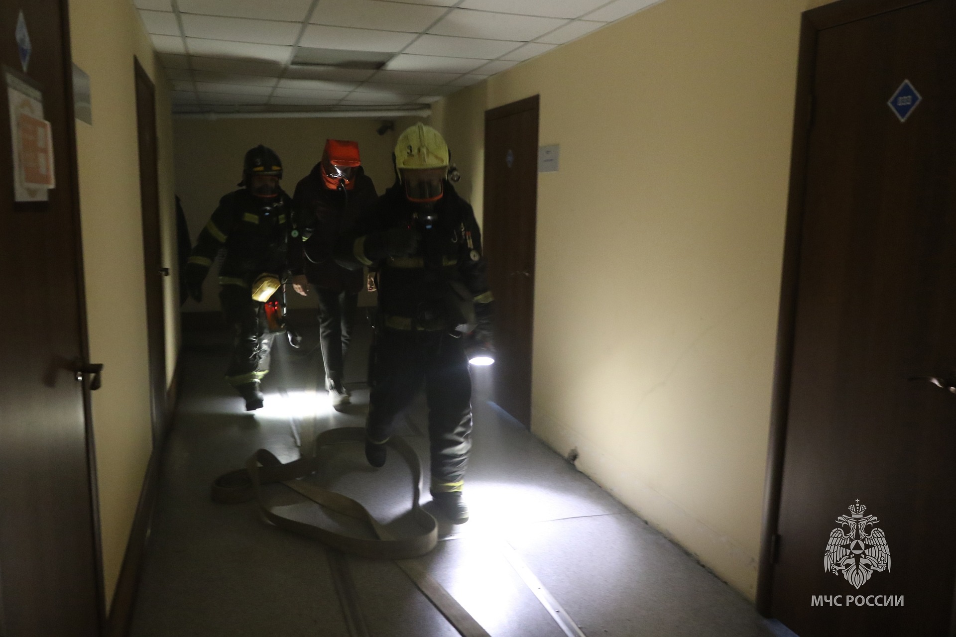 Прибывшие подразделения МЧС России встретил представитель предприятия, который сообщил, что в здании остались два человека. На их поиск и спасение отправились звенья газодымозащитной службы. Первый условный пострадавший подал о себе знак, закрепив на окне яркую папку, а также сигнализировал о помощи руками. Второго пострадавшего спасатели обнаружили и вывели с цокольного этажа здания.