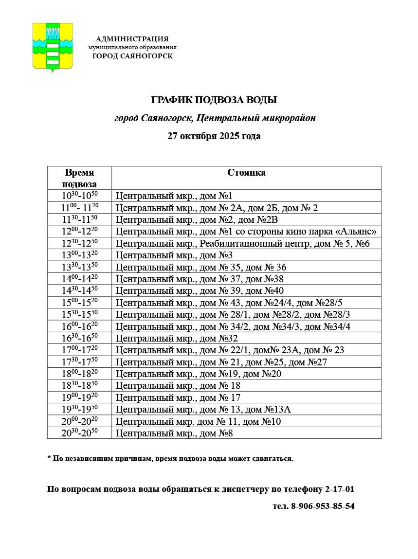 27 и 28 октября будет открыта горячая линия для приема заявок на подвоз воды. С 8:00 до 20:00 оставить заявку можно по телефонам: 8(39042)2-39-65 и 8(39042)2-17-01, круглосуточно – по номеру: 89069538554.